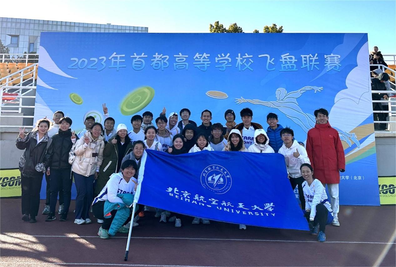 北航极限飞盘社成立于2018年,在校园内积极开展飞盘运动的推广,近两年连续获评“五星级社团”称号。2023年上半年,北航飞盘代表队正式成立,在首都高校极限飞盘锦标赛中获得季军。北航飞盘联赛作为颇具影响力的校内赛事之一,已顺利举办两届,每年有超过20个学院、200余名同学参加。2023年9月,面向全校本科生的飞盘俱乐部课正式开课,旨在加强飞盘运动在校园内的普及推广,让更多的同学感受到飞盘运动的乐趣。