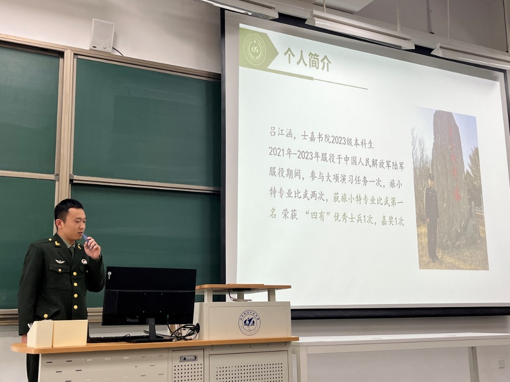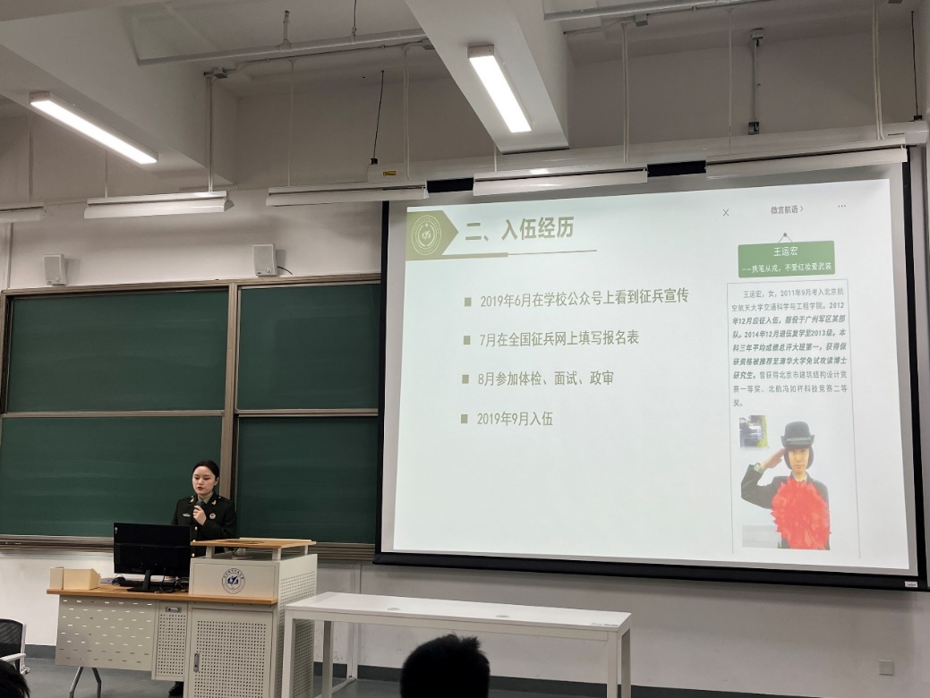 来自北航退役士兵宣讲团的潘盈宇同学作题为“入伍经历分享——北航退役士兵宣讲团征兵宣讲”的主题分享。潘盈宇从个人简介、入伍经历、参军收获以及返校生活四个方面向同学们介绍了她积极响应国家号召,参军入伍,并在部队中收获累累硕果的故事。在部队中,她收获了与亲人、朋友、同学之间的感情所无法比拟的宝贵战友情,同时跳出了自己的专业,学习新知识、新技能,深入体验和感受了不同城市的气候与人文。