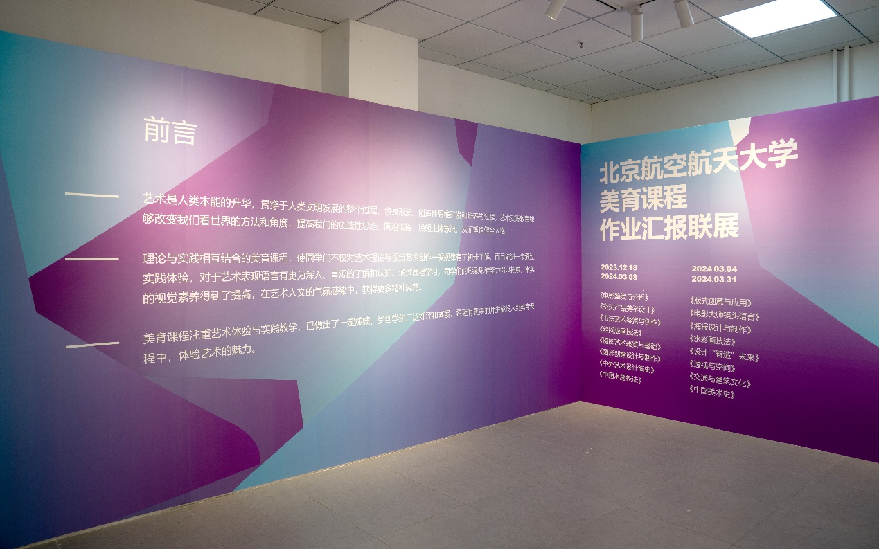 北航新闻网12月25日电(通讯员 高蕊)2023年12月18日-2024年3月3日,北京航空航天大学美育课程作业汇报联展(第一展期)在沙河校区艺文空间展出,对学校师生及社会观众开放。展览由北京航空航天大学美育中心主办。