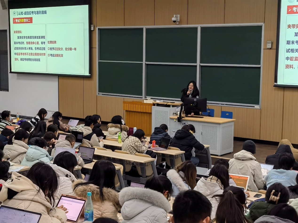 辅导员何璐讲解了考试违规行为的认定及处分方法,通过真实案例指出作弊违纪行为的严重后果,希望同学们诚信应考,积极应对挑战。同时,从如何制定合适备考计划、调整备考心态、怎样利用好身边资源等多方面为同学们提供备考建议,鼓励同学们把握学习机会,提升学习能力。会后,同学们签订诚信考试承诺书,承诺将自觉遵守考试纪律。