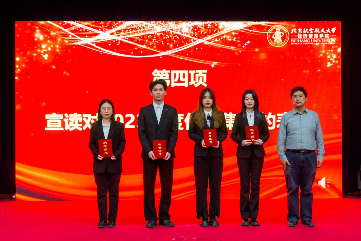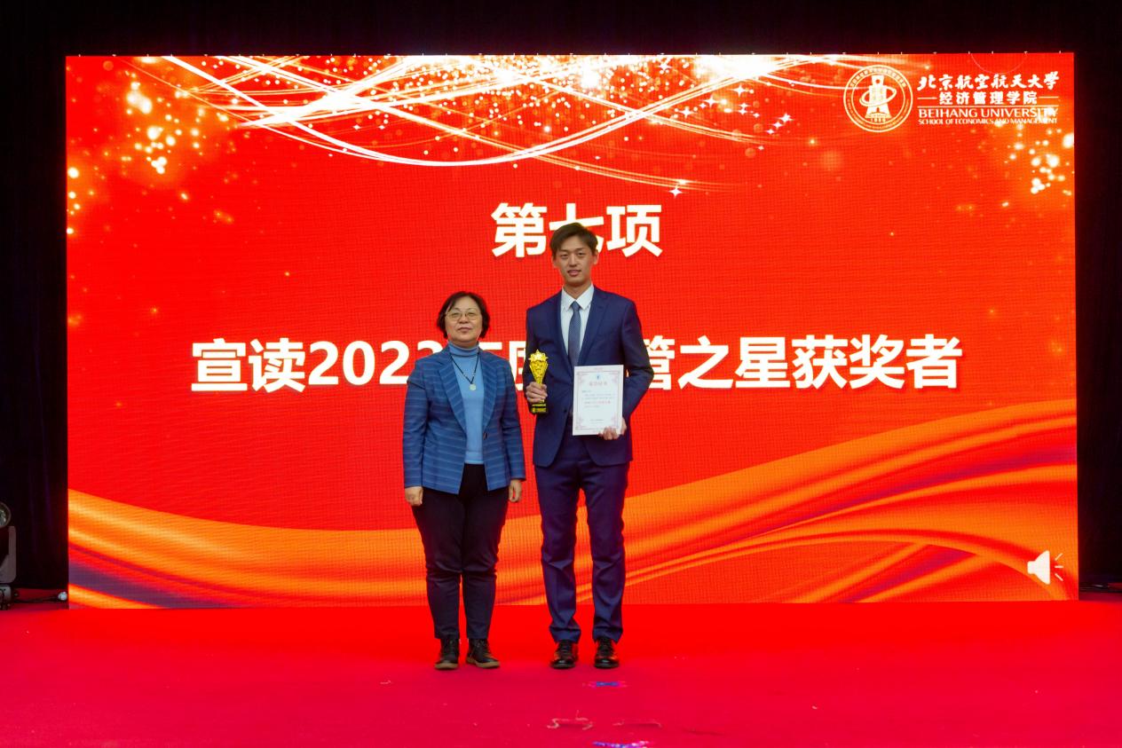 学院院长范英为经管学院年度最高荣誉“2023年度经管之星”获奖人——2020级本科生赵唯至同学颁奖。赵唯至同学大学四年专业排名第一;获挑战杯黑科技赛道特等奖,被央视采访报道;荣获北航本科生最高荣誉“沈元奖章”。