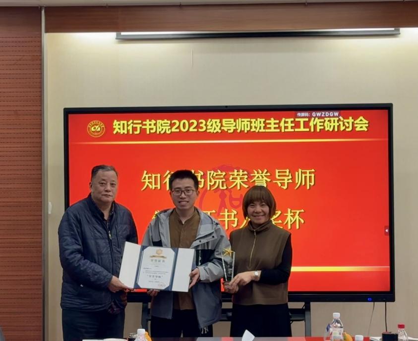 随后举行了知行书院荣誉导师颁奖仪式,根据知行书院制度,在书院工作满五年的导师,会获得知行书院荣誉导师(一星)称号,每满五年加一星,本年度获得知行书院荣誉导师(一星)称号的是来自人文公管学院的李跟强老师,知行书院院长郑晓齐、学业总导师沈映春分别为李跟强老师颁发了证书及奖杯。李跟强老师分享了自己在导师工作中的经验和感受,他强调导学工作应紧密结合学生需求,助力学生实现从高中到大学思维模式的转变,促进其全面发展。