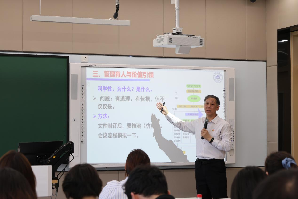 培训第二讲由积极心理体验中心主任马喜亭教授作《建设积极心态,服务师生成就自己》专题讲座。马喜亭分析了管理育人、服务育人的重要性,强调青年教职工要始终坚持以师生为本,强化科学管理对道德涵育的保障功能,引导青年教职工在管理服务中建设积极心态,助力营造治理有方、管理到位、风清气正的育人环境。