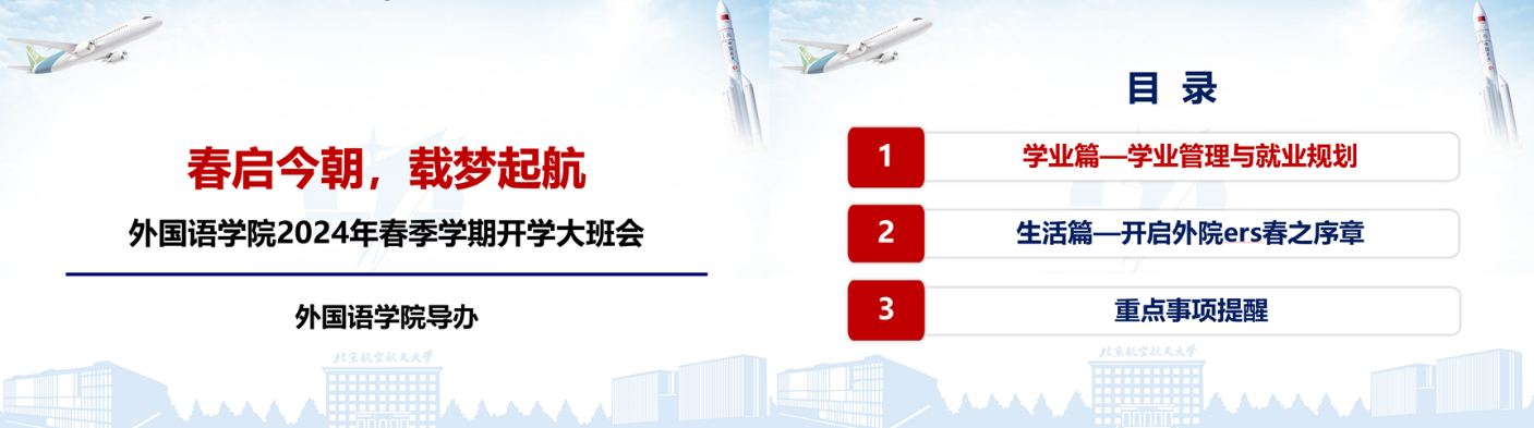 开学初,辅导员集体备课准备“开学第一课”大班会PPT,经过讨论及修改,形成模板,并根据各年级不同特点加入专四专八考试、“航语杯”竞赛准备、学位论文准备、生涯规划指导等有针对性的内容。