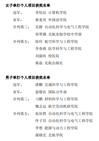 本次赛事包括个人赛和团体赛。其中,个人赛包括男子单打和女子单打,团体赛每支队伍由6-10名运动员组成。4月15日至19日期间,来自17个单位共15支队伍分组展开了团体赛小组循环赛,经过激烈角逐,8支队伍脱颖而出,晋级八强。