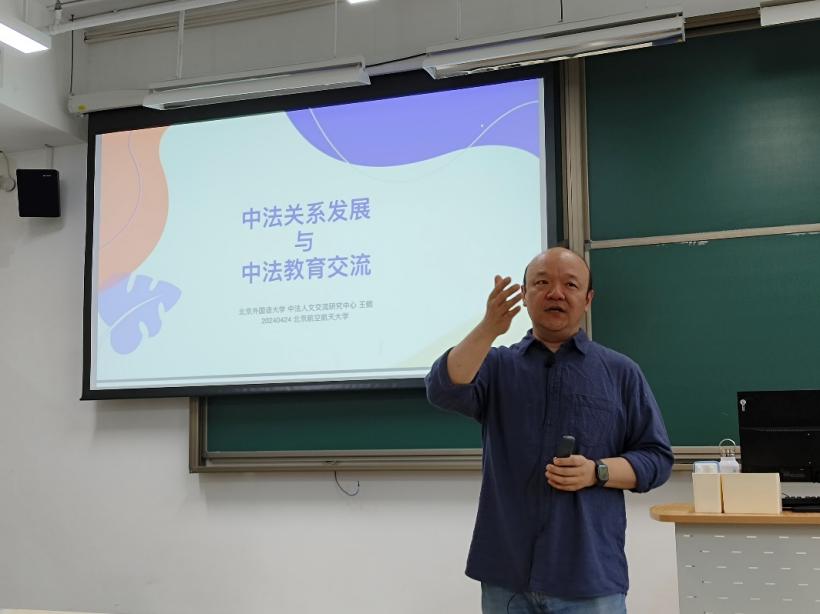 北航新闻网5月8日电(通讯员 吴硕 王柳青/文 田璐晗/摄影)4月24日下午,国际合作部联合法国研究中心举办的“北航法国文化系列讲座”第三期在学院路校区三号楼215教室举行。此次活动邀请了北京外国语大学法语学院副院长及教育部中法人文交流研究中心(北外)负责人王鲲教授。王鲲以《中法关系发展与中法教育交流》为主题,为同学们带来了一场内容丰富的讲座。来自外国语学院、中法学院、机械学院等学院的共计100余名同学认真聆听了此次讲座。