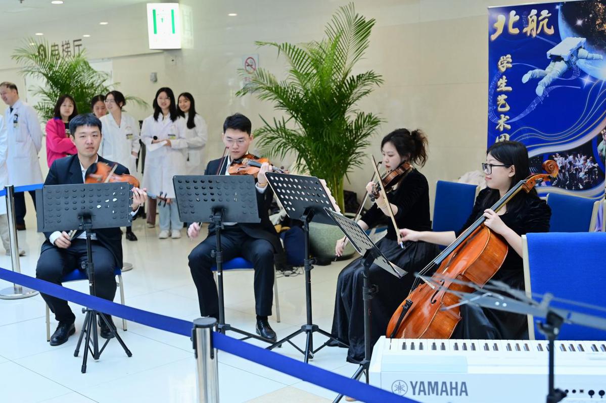 中国日报4月1日电(记者 赵磊)记者从北京航空航天大学获悉,日前,来自北航学生艺术团弦乐四重奏团的学生们联手协和协韵演奏团,在北京协和医院东单院区的门诊大厅里,共同为患者、家属和医务工作者带来了“协手同航”公益演出活动。北航校团委书记刘洋,副书记赵圆和北航学生艺术团学生代表参加活动。