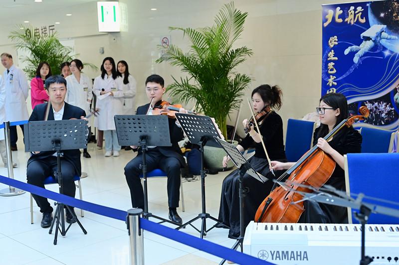 来自北航学生艺术团“福新高赵”“和音雅集”弦乐四重奏团的学生们带来了4首广受大众喜爱的歌曲,既有传统文化的动人呈现,又有西方音乐的经典旋律,《上春山》《梁祝·化蝶》《My heart will go on》《大鱼》……以音乐疗愈患者,以艺术致敬医务工作者,吸引了不少观众驻足聆听。
